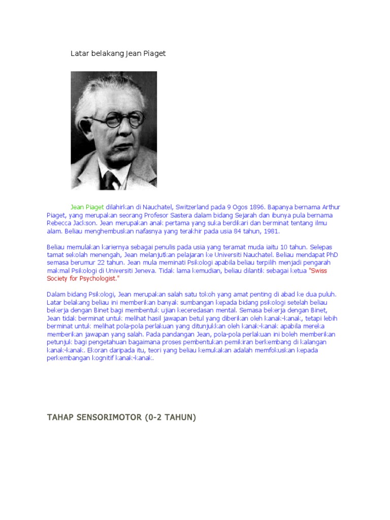 LATAR BELAKANG JEAN PIAGET. Bapanya bernama Arthur Piaget yang merupakan seorang Profesor Sastera dalam. Tahap sensorimotor umur 0 2 tahun Pada tahap sensorimotor anak.